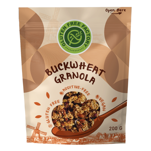 Ingredients: Raw buckwheat (74%), Date juice, Cinnamon buckwheat flakes (Raw buckwheat, chickpeas, rice and cinnamon), Apple concentrate, Cinnamon, Olive oil.