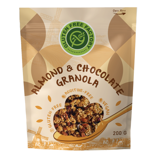 Ingredients: Raw buckwheat (50%), Gluten-free oatmeal (24%), Date juice, Cinnamon buckwheat flakes (Raw buckwheat, chickpeas, rice and cinnamon), Shredded almonds (5%), Dark chocolate (5%) (Cocoa mass, cocoa butter, emulsifier, flavoring-vanilla), Apple concentrate, Cinnamon, Olive oil.